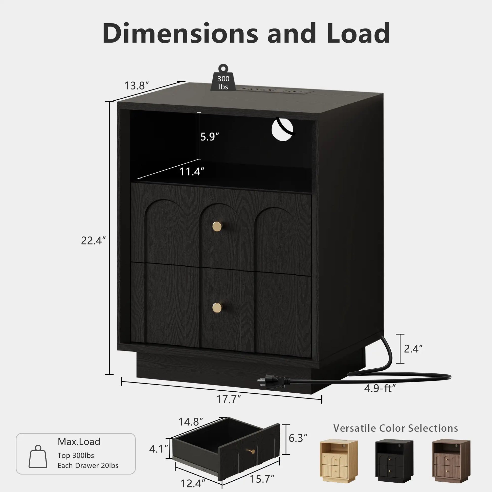Upgrade your bedroom with the Mid-Century Black Wood Arch Nightstand with Drawers—a piece that merges timeless mid-century charm with everyday convenience. Crafted from sleek black wood, it stays true to mid-century aesthetics, while its elegant arch details add soft, eye-catching character to your bedside. This Mid-Century Black Wood Arch Nightstand with Drawers goes beyond style: it features a built-in charging station to keep your phone and tablet within arm’s reach, plus spacious drawers that neatly stow books, glasses, and nightly essentials. Designed to cut clutter without sacrificing sophistication, its modern silhouette blends seamlessly with cozy or contemporary bedroom decor—turning your bedside into a tidy, inviting retreat. Whether you’re unwinding at night or prepping for the day, this nightstand balances black wood’s boldness, arch-inspired charm, and practical storage perfectly.